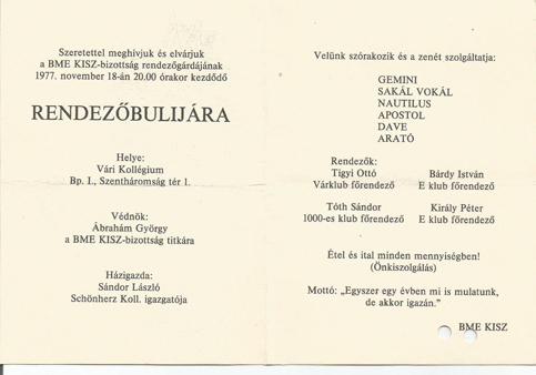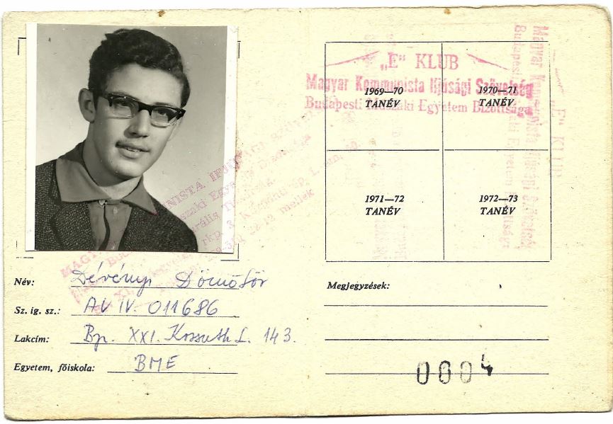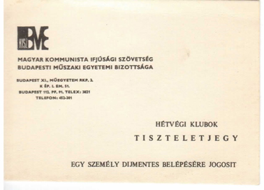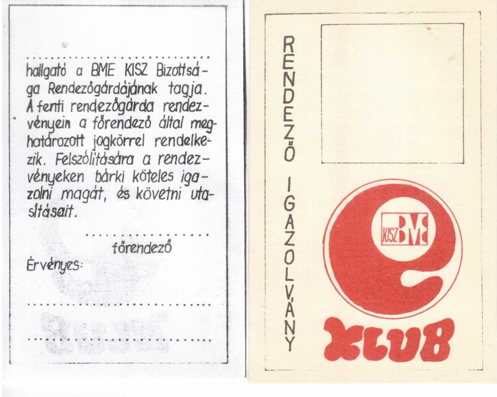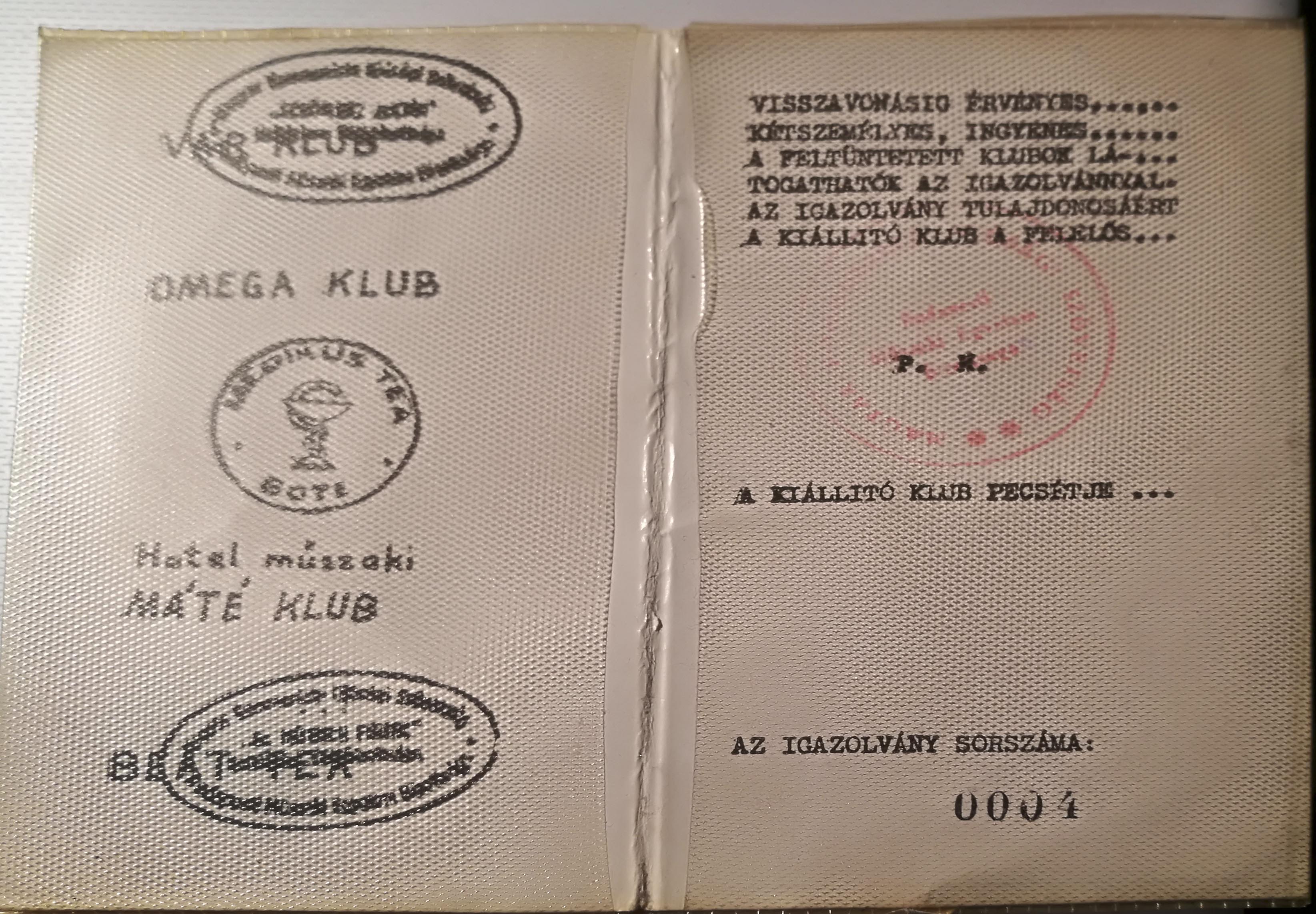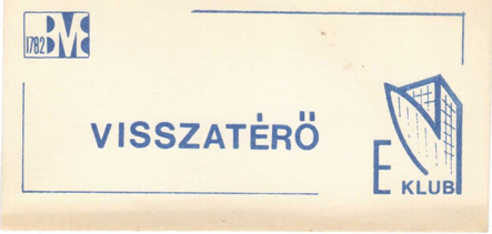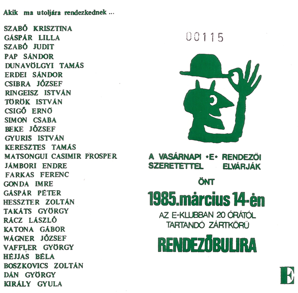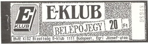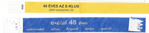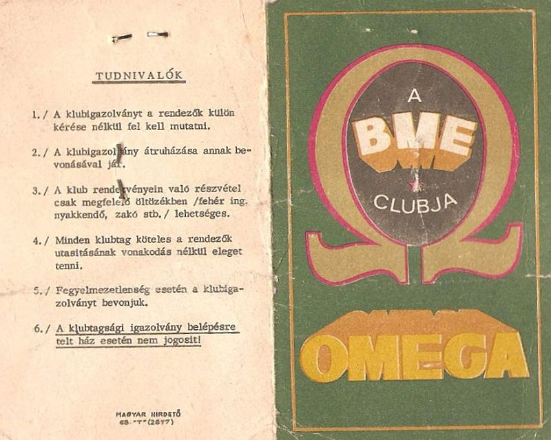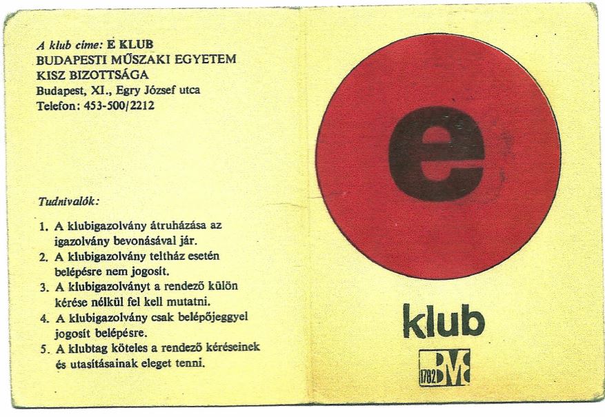 Régi tagsági igazolványok, belépők Az első tagságik egyike (0004-es sorszámú) A tagsági hátlapja Omega klub tagsági Rendező igazolvány KISZ belépő (igazolvány) Tiszteletjegy (KISZ) Visszatérő jegy Omega klub rendezőjelvény E klub rendezői jelvény E klub belépőjegy Rendező igazolvány 1983- Rendezőbuli meghívó 1977 Régi E-klub bejárat feletti tábla Belépő karszalagok Vasárnapi rendezőbuli meghívó 1985